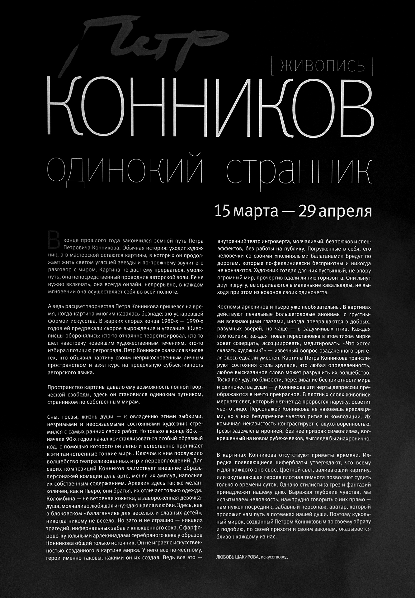 На дан­ной стра­ни­це опуб­ли­ко­ва­ны фото­ко­пии поло­тен гран­ди­оз­но­го петер­бург­ско­го худож­ни­ка Петра Конникова (1955 — 2017), пред­став­лен­ные вес­ной 2018 г. на его ретро­спек­тив­ной выстав­ке «Петр Конников. Одинокий стран­ник» в Музее искус­ства Санкт-Петербурга XX — XXI вв.