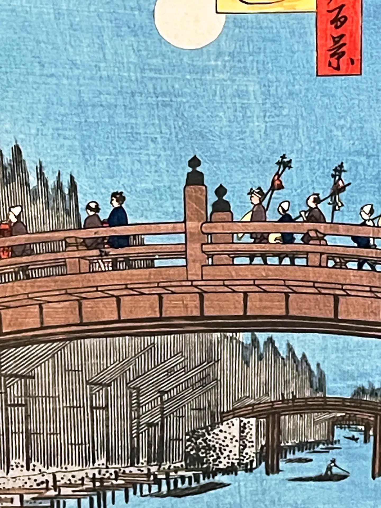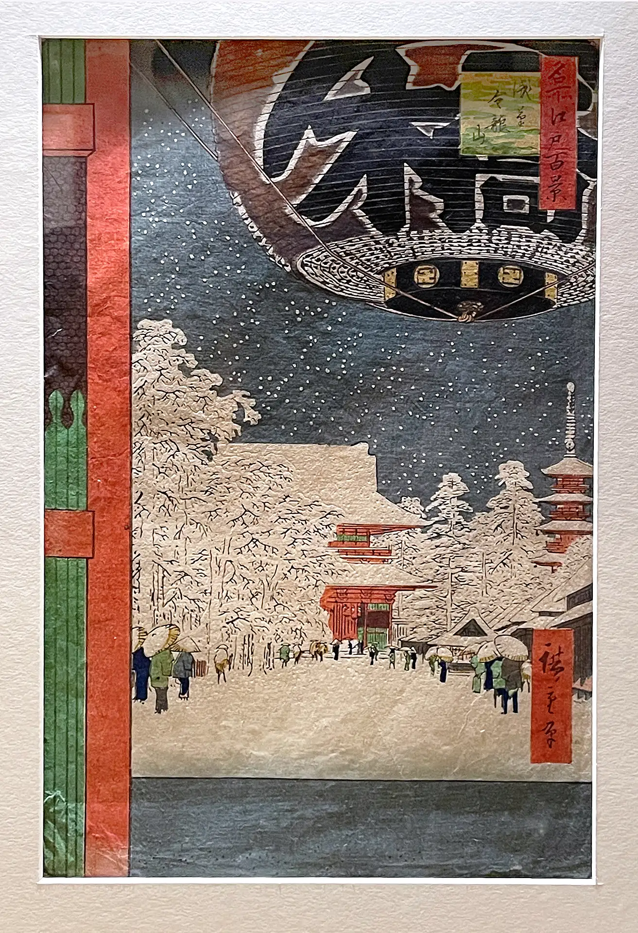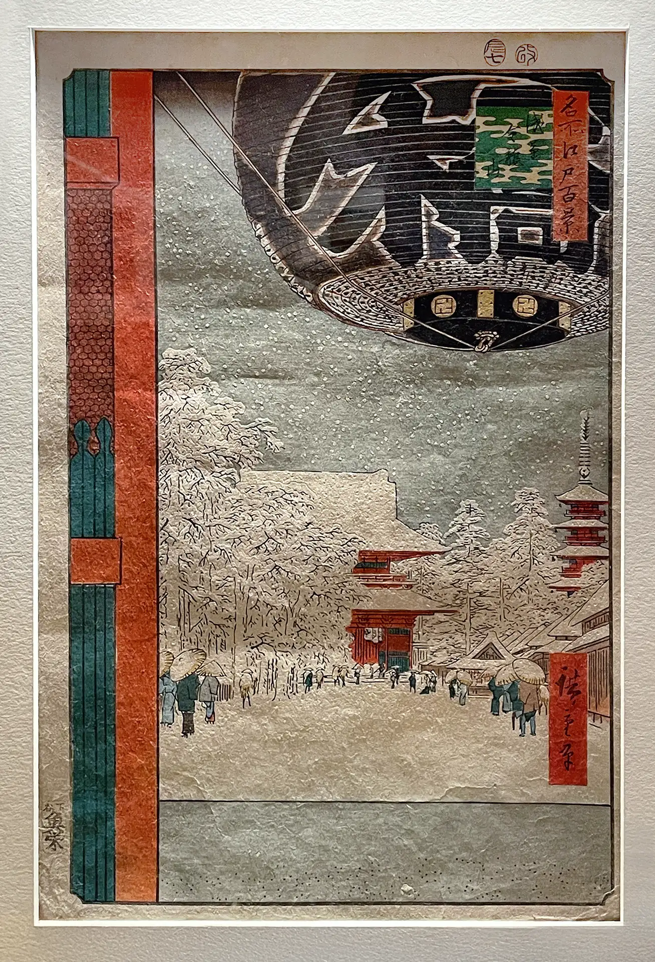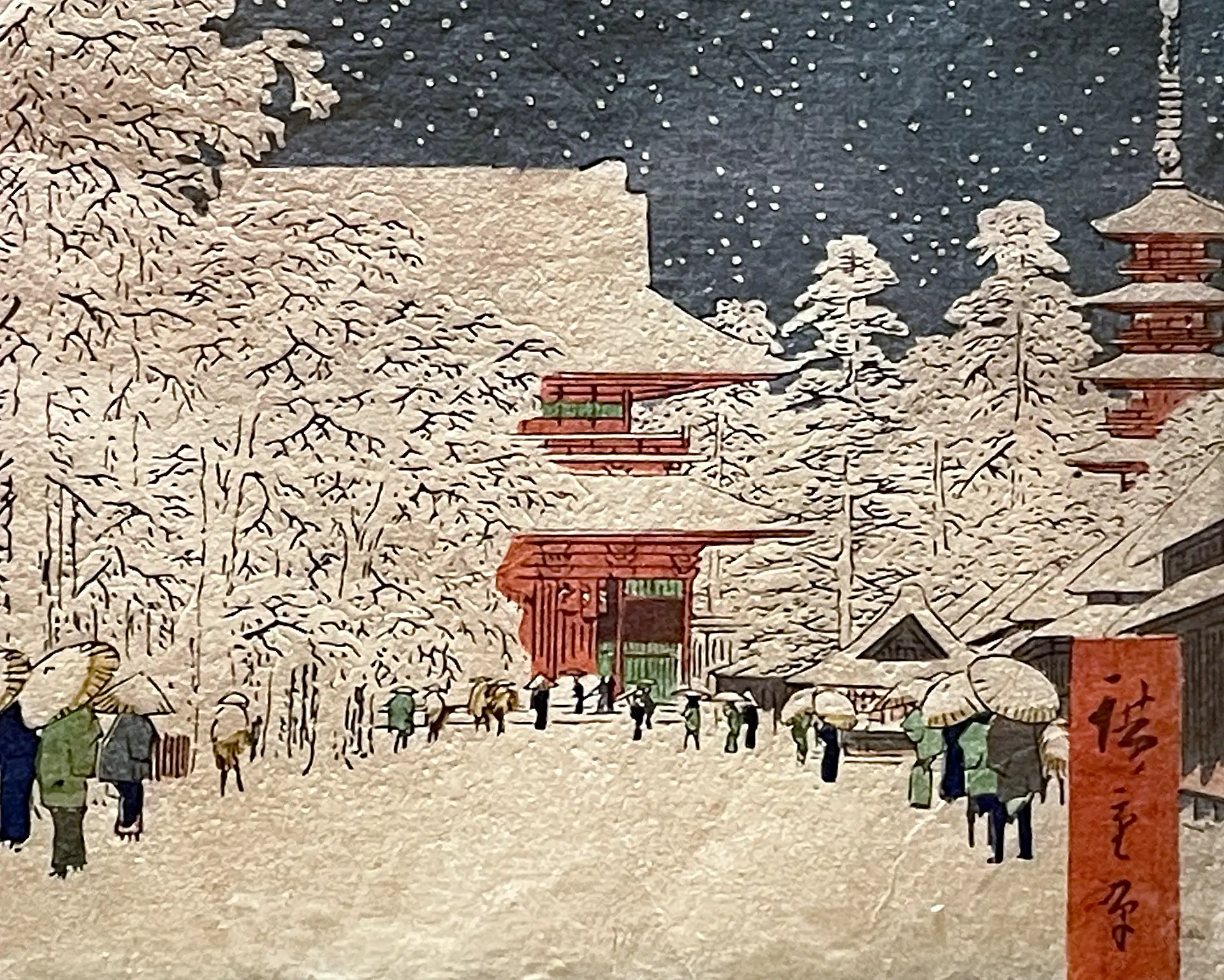 Знаме­ни­тая пей­заж­ная серия Утагавы Хиросигэ «Сто зна­ме­ни­тых видов Эдо», впер­вые опуб­ли­ко­ван­ная в тыся­ча восемь­сот пяти­де­ся­тых годах, явля­ет­ся одной из самых про­слав­лен­ных кол­лек­ций япон­ской гра­вю­ры, когда-либо создан­ных. В этих листах Хиросигэ запе­чат­лел места в самом Эдо и его окрест­но­стях (в совре­мен­ном Токио) во все четы­ре вре­ме­ни года, часто выби­рая необыч­ные точ­ки зре­ния. Гравюры поль­зо­ва­лись огром­ной попу­ляр­но­стью уже при жиз­ни худож­ни­ка и мно­го­крат­но пере­из­да­ва­лись, ино­гда в виде наме­рен­ных, твор­че­ских вари­а­ций. Интерес Хиросигэ к экс­пе­ри­мен­там с атмо­сфер­ны­ми эффек­та­ми (а так­же стрем­ле­ние его изда­те­ля обнов­лять потре­би­тель­ский спрос) при­во­дил к появ­ле­нию вер­сий, кото­рые могут демон­стри­ро­вать пора­зи­тель­ные раз­ли­чия в цвете.